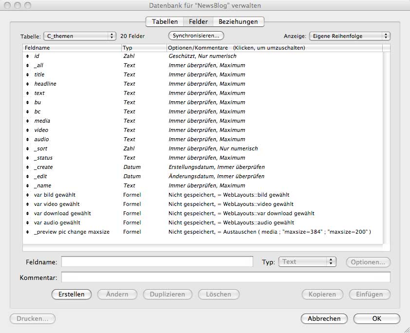 Konkret: Gab es bisher ein Feld mit dem Namen _auto welches in der MySQL zu _auto_neu umbenannt wurde, enthält die FileMaker Tabelle jetzt beide Felder. Um das Löschen der alten Felder muss ich mich also selbst kümmern. Ebenso muss ich die Feldzuweisung im Layout selbst ändern.