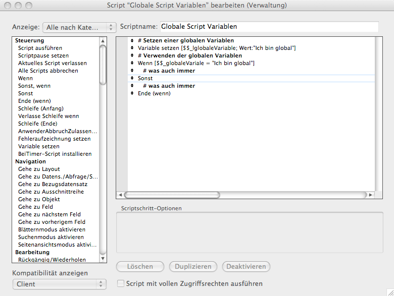 In FileMaker Pro werden die globalen Variablen mit dem Scriptbefehl VariableSetzen angelegt. Die globale Variable beginnt im mit einem doppelten $ Zeichen. Die Gültigkeit der globale Variable ist nicht auf das aktuelle Script beschränkt. Man kann diese Variable in einem anderen verwenden ohne sie über den Scriptbefehl VariableSetzen anzulegen. Globale Variablen werden in der Regel über ein eigenes Script angelegt, in dem gleich alle globalen Variablen mit Werten belegt werden. Aus Gründen der Übersichtlichkeit sollten globale Variablen statisch verwendet werden. Das bedeutet, der Wert wird einmalig zugewiesen und bleibt dann unverändert (statisch) im gesamten Programm erhalten.